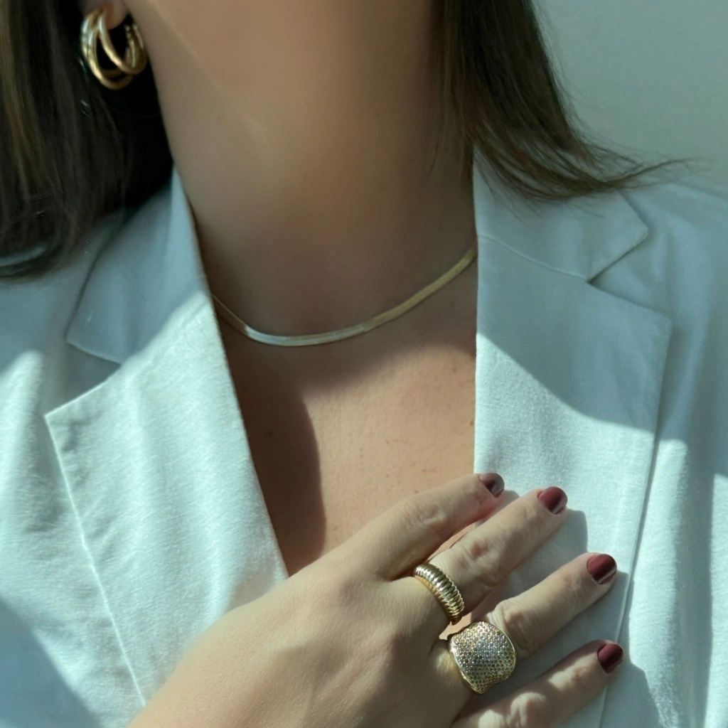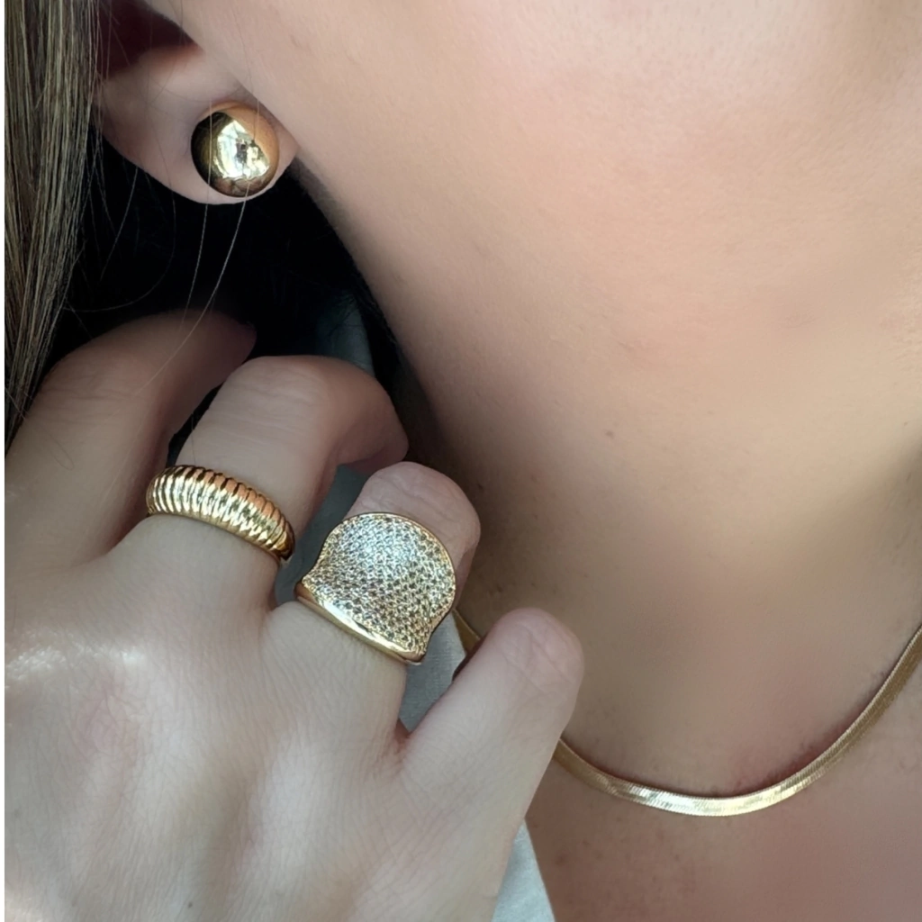 O design largo e luxuoso deste anel é perfeito para ocasiões especiais, como festas, casamentos ou eventos noturnos. Ele também pode ser usado como uma peça central em seu visual diário, elevando instantaneamente qualquer conjunto.