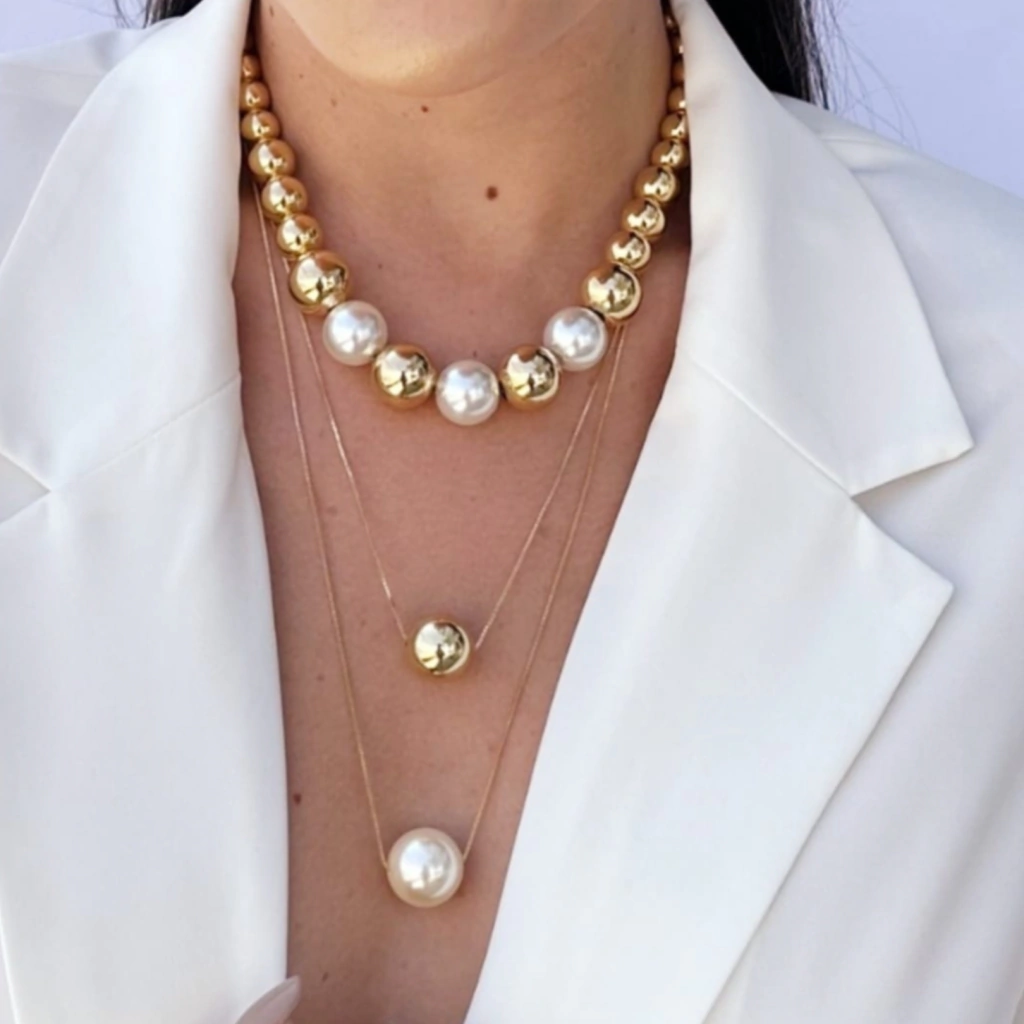 Perfeito para elevar seu estilo cotidiano ou para complementar um look especial, este colar é uma escolha versátil que se adapta a diversos estilos pessoais. Seja para um evento formal ou para um encontro casual, a combinação única de bolas degradê e pérolas grandes faz deste colar um verdadeiro destaque.
