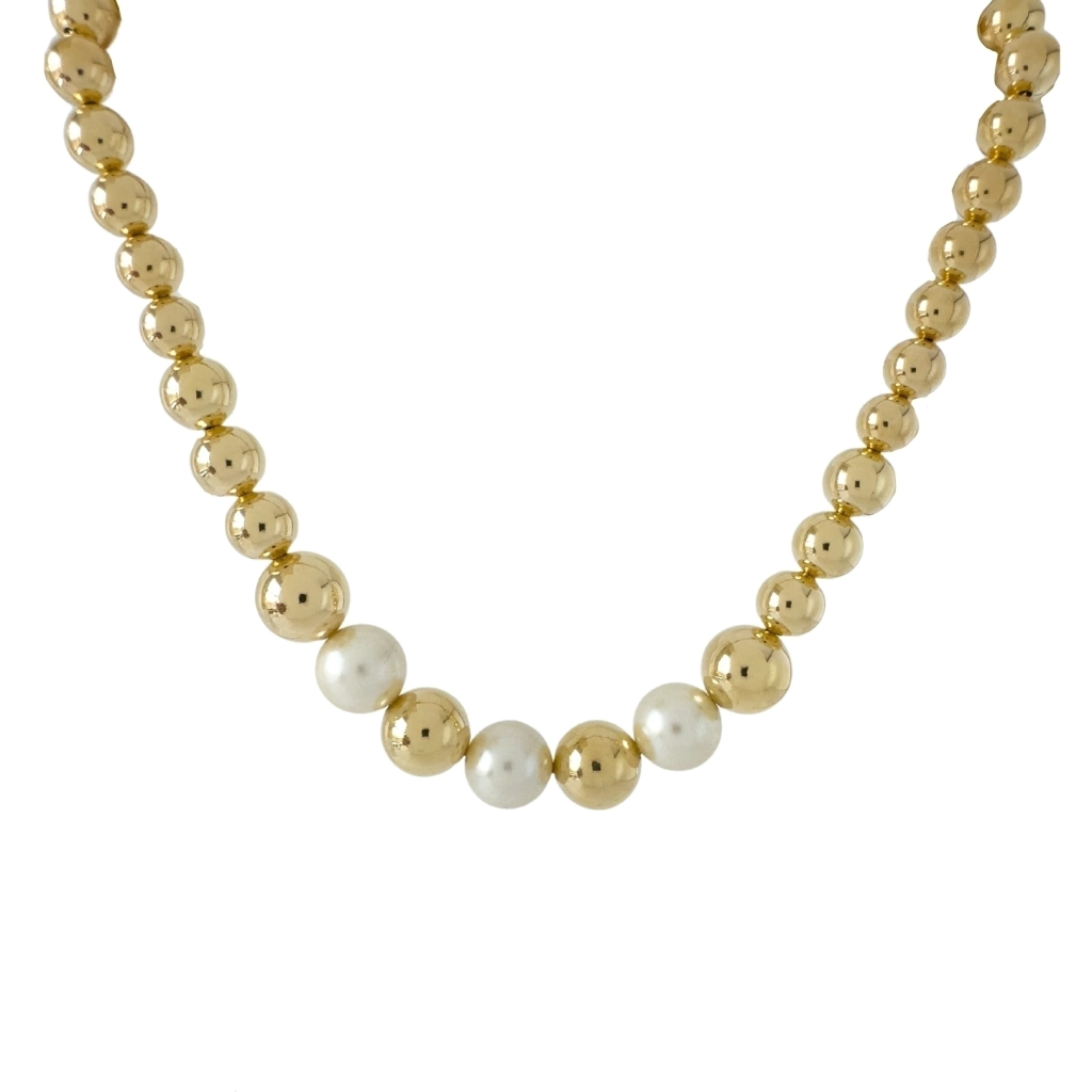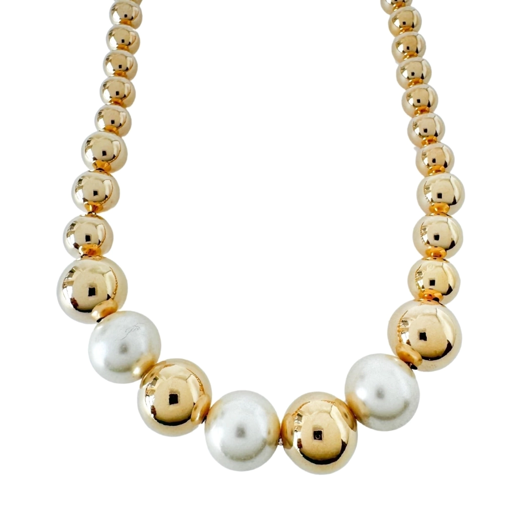 Celebre a sua beleza única com o nosso colar com bolas lisas degradê e pérolas grandes, uma expressão de elegância e charme que certamente cativará olhares.